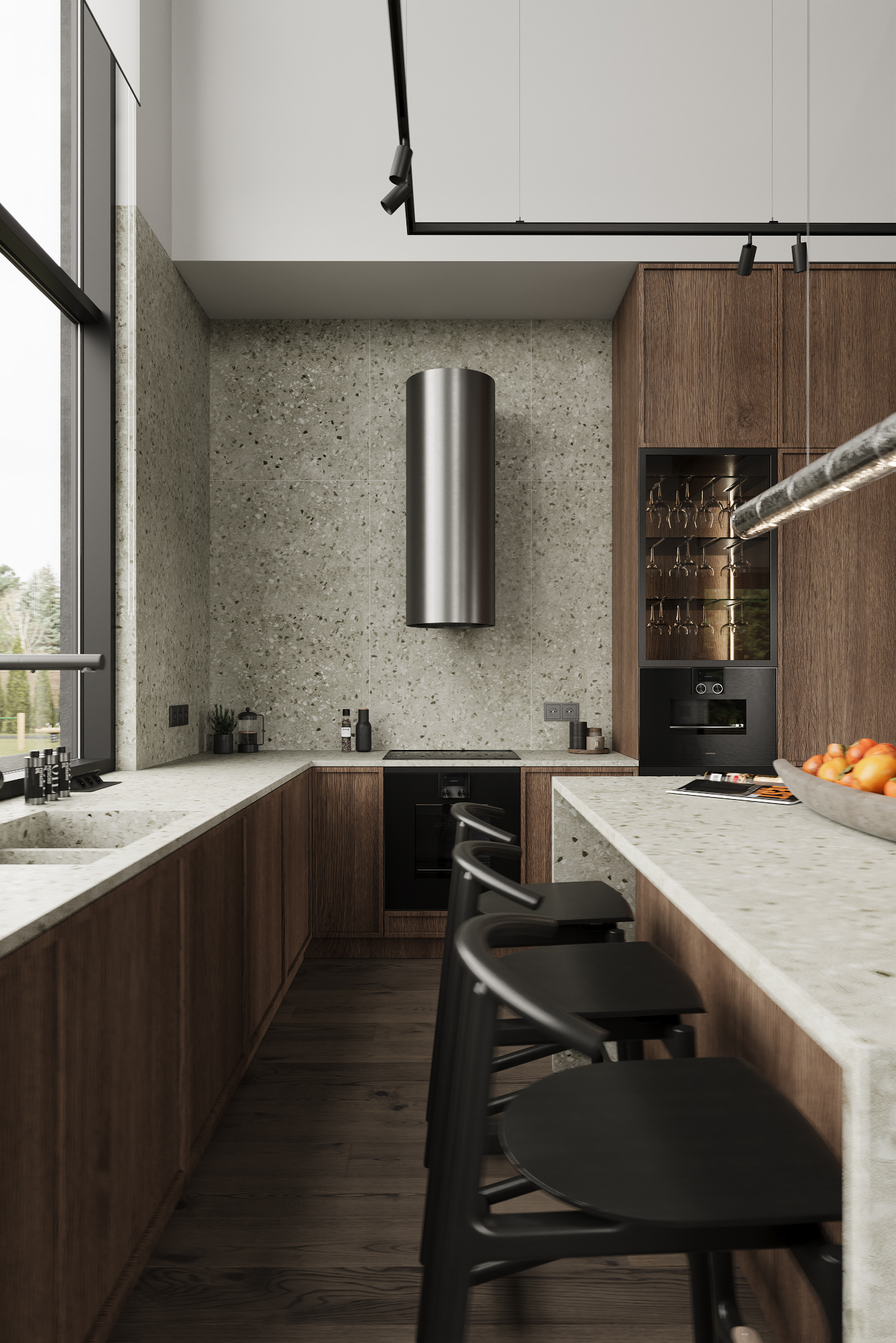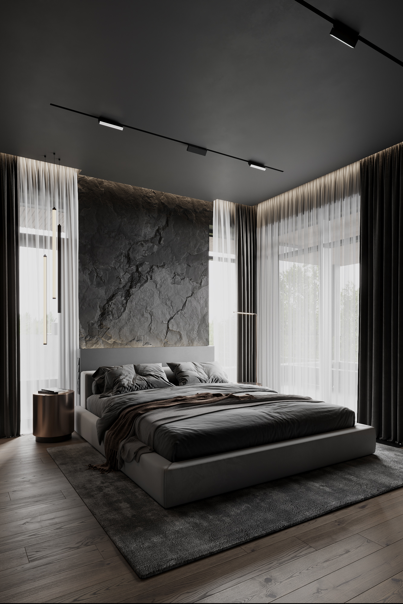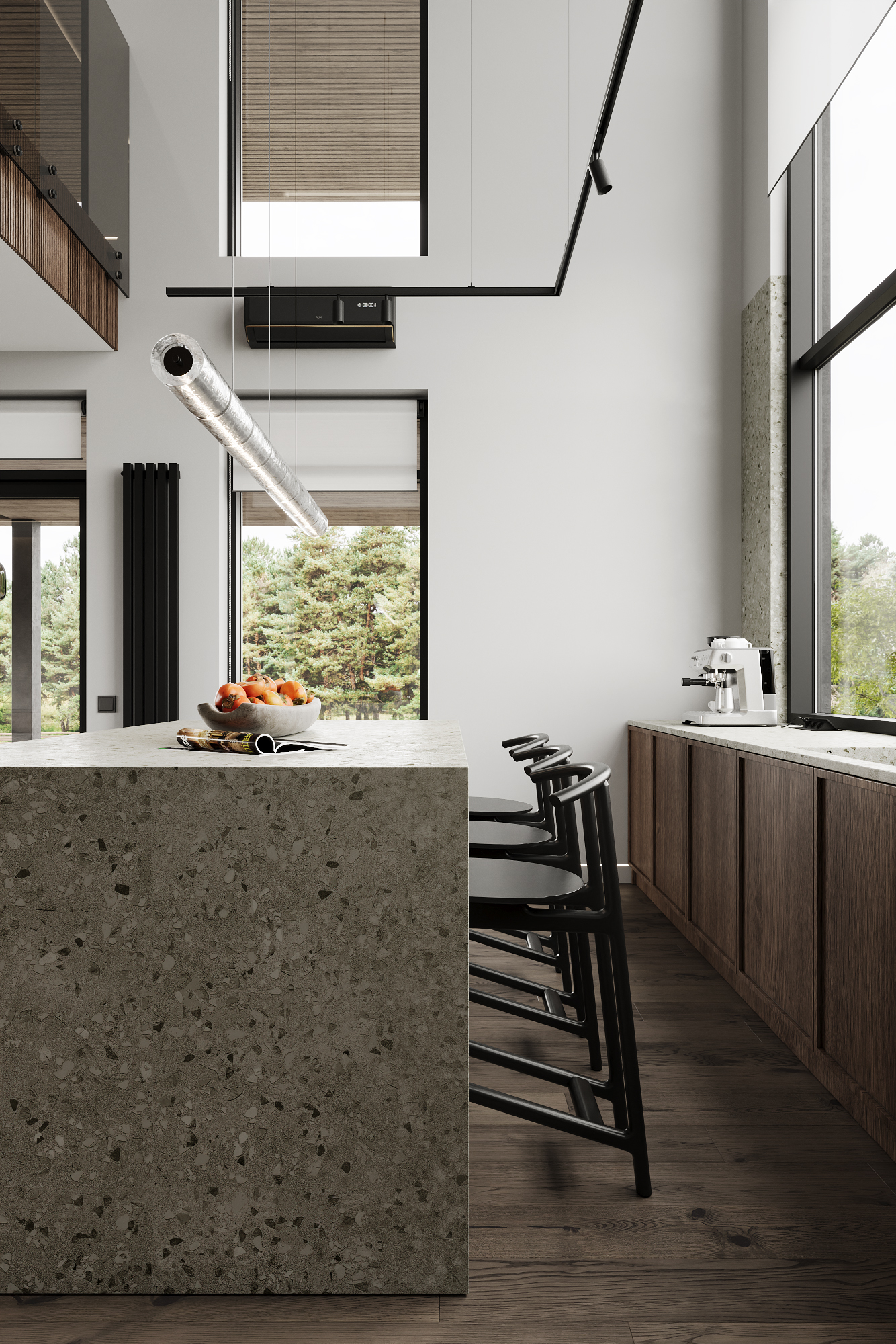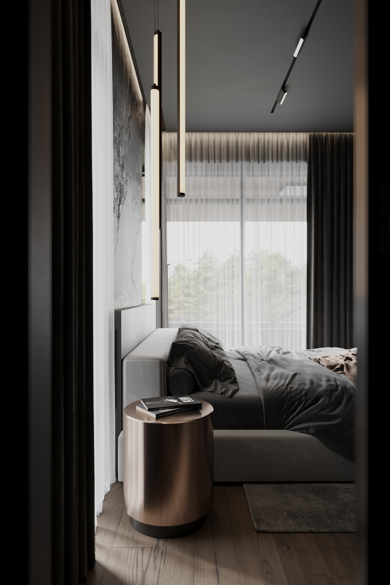 Строительство дома - это самый эффективный способ объединить интерьер с нужным вам окружающим ландшафтом и всеми красотами природы. Всего в часе езды от большого города реализовалась именно такая комбинация строгого минималистичного интерьера и ландшафта, имеющего небольшой естественный уклон, что придаёт рельефу участка комфортную визуальную динамику. Конфигурация дома включает в себя 180 кв.м., на которых расположилась большая кухня-гостиная со вторым светом, рабочий кабинет, две гардеробные, мастер-спальня, детская и гостевая комната.